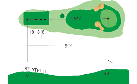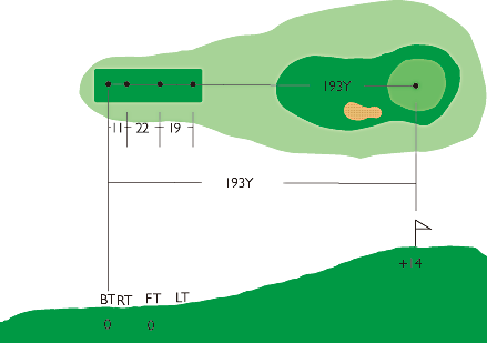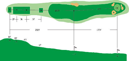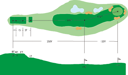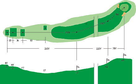 第2打地点より狭くなり、左右OBがあって第2打の正確さがポイント。やや打ち上げで距離も意外にあるので難しい。ピンの位置によってクラブの選択が必要。