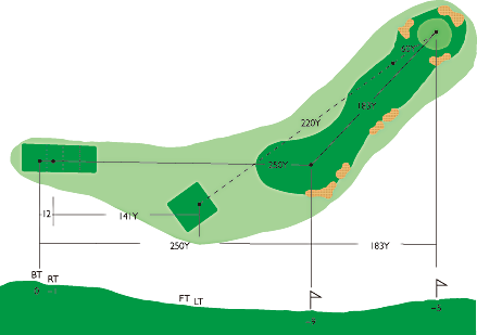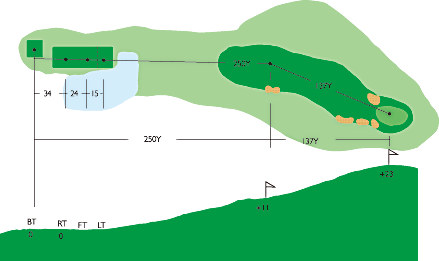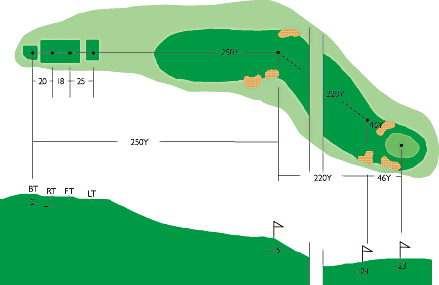 左ドックレッグのミドルホール。150ヤード標識まで267ヤード右側は、222ヤードでバンカー、第2打は距離がややあり右側に落とすと次打が難しい。第1打はクラブハウス屋根の右はじ狙いがベスト。