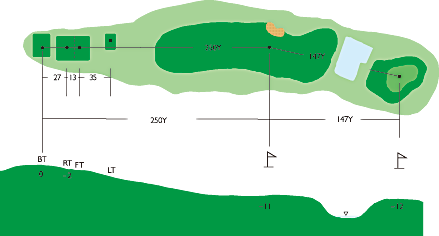 第2打が池越えのミドルホール。左側グリーン後方までOB。クロスバンカーまで245ヤード。ティーショットはやや右目狙い。グリーンはクセがないがアプローチは難しい。グリーン中央狙い。